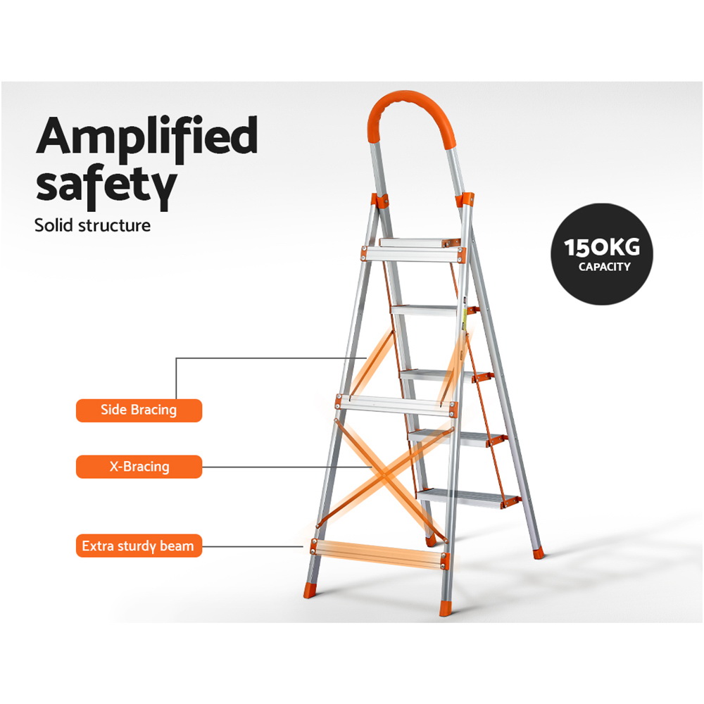 Climb your way to the top with the Giantz 3/4/5/6 Step Ladder. Made from a lightweight aluminium construction, the step ladder is easy to carry but incredibly stable. The ladder has an X brace at the back, side braces and an extra sturdy beam towards the base, making it extra safe and stable when working at height. It features a scoured anti-slip tread on each step, a foam easy-grip safety handle and non-slip rubber feet to prevent slipping and floor damage. The ladder folds down easily to 5cm wide, so you can easily slip it into any storage space. It is easy to carry and suitable for all kinds of odd jobs, indoors or outdoors. No matter what needs work around your home, have a Giantz 3/4/5/6 Step Ladder at the ready!