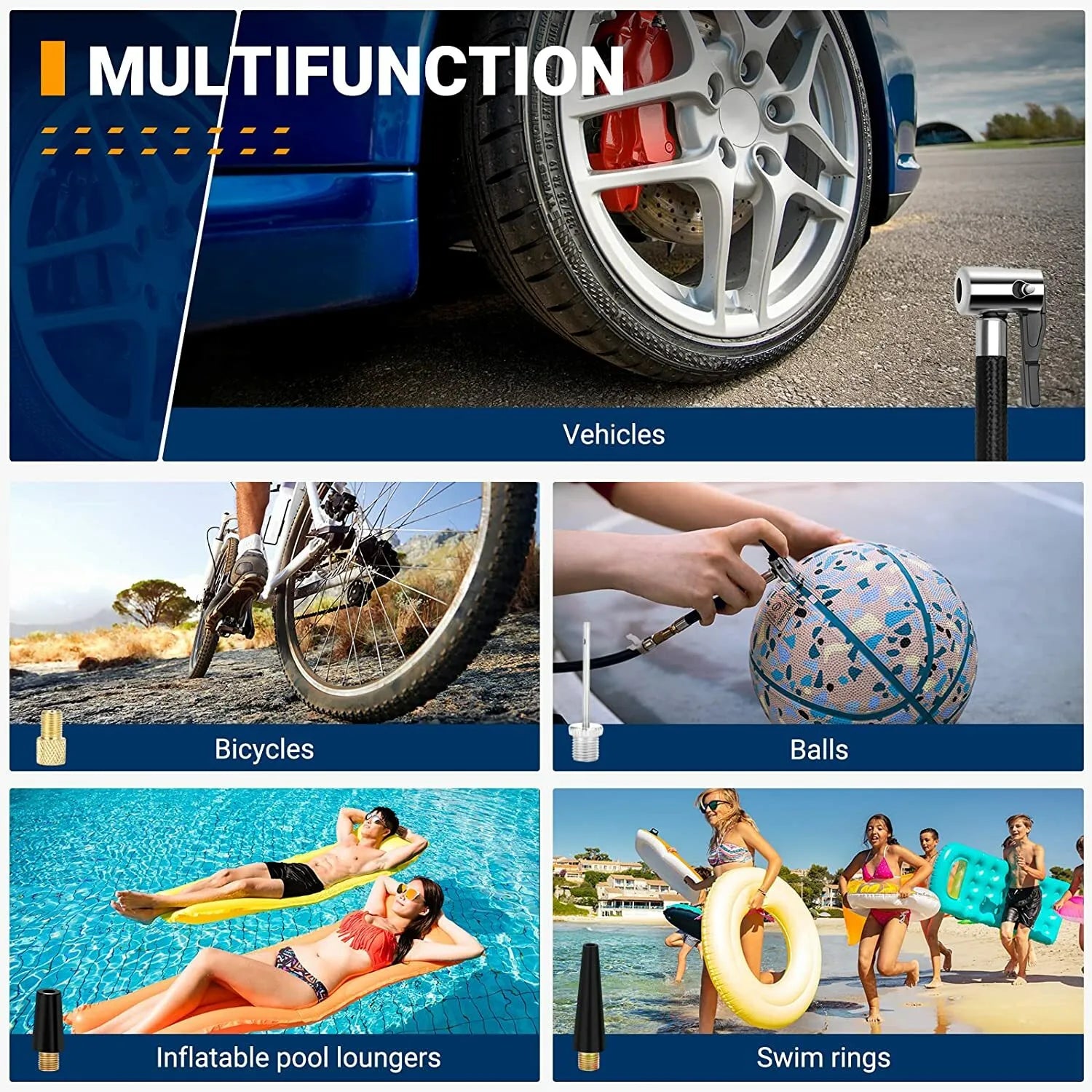 Multiple Uses: The portable Auto Tire Pump comes with a 10ft power cord and inflatables adaptors (3 additional nozzles), makes it perfect for cars, trucks, motorcycles, bicycles, inflatable boats, sports balls, air mattress and other inflatables.